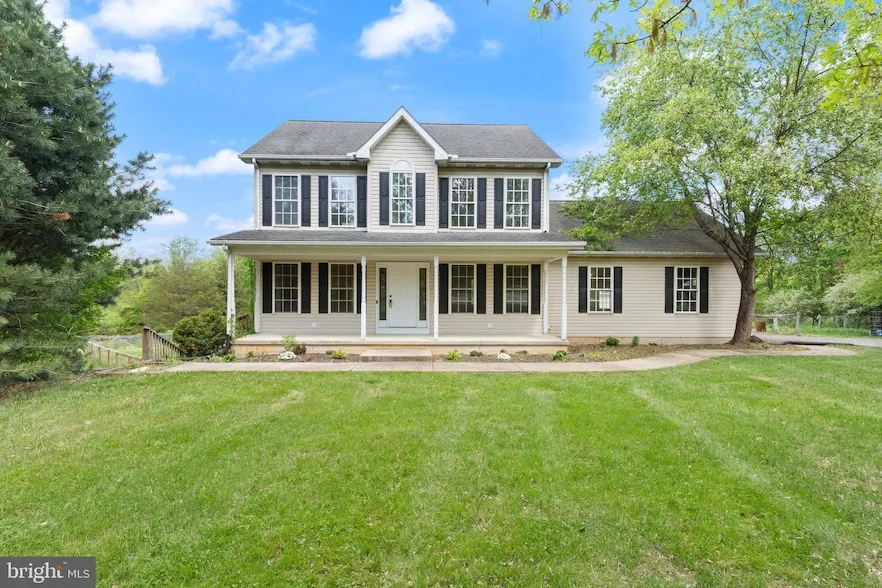 Nestled at the end of a private road in the Stubbs Hill community of Rising Sun, this 3-bedroom, 2.5-bath Colonial offers the perfect blend of comfort, charm, and country living on 3.7 acres. Set on a quiet cul-de-sac, this farmette features three finished levels, a functional barn, and room to relax, play, or expand. A covered front porch invites you in to a tiled foyer with crown molding, leading to a bright office or den with French doors. The kitchen offers maple cabinets, stainless steel appliances, a double sink, and a casual dining area flowing into a spacious family room with a wood-burning fireplace, crown molding, and plenty of space to gather. A formal dining room, main-level half bath, and thoughtful finishes complete the main floor. Upstairs, the primary suite features a tray ceiling, ceiling fan, and private bath with a soaking tub, stall shower, and double vanity. Two additional bedrooms and a full hall bath complete the upper level. The full, recently partially finished walkout basement includes a large recreation space with 9-foot ceilings and natural light perfect for hobbies, storage, or future finishing. Outside, you ll find a rear deck, fire pit, and a versatile barn with three horse stalls, a feed and tack room, and loft storage. A side-loading two-car garage and crushed stone driveway add everyday convenience to this peaceful rural setting. If you ve been searching for space, privacy, and possibility this Rising Sun retreat is ready to welcome you home.