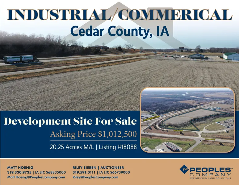 Peoples Company is pleased to present an exceptional 20.25-acre m/l development tract located at the Tipton Exit 267 along U.S. Interstate 80 and access from Highway 38. Strategically positioned between Iowa City, IA, and the Quad Cities, this property boasts unparalleled accessibility and visibility, making it an ideal location for a wide range of business opportunities.