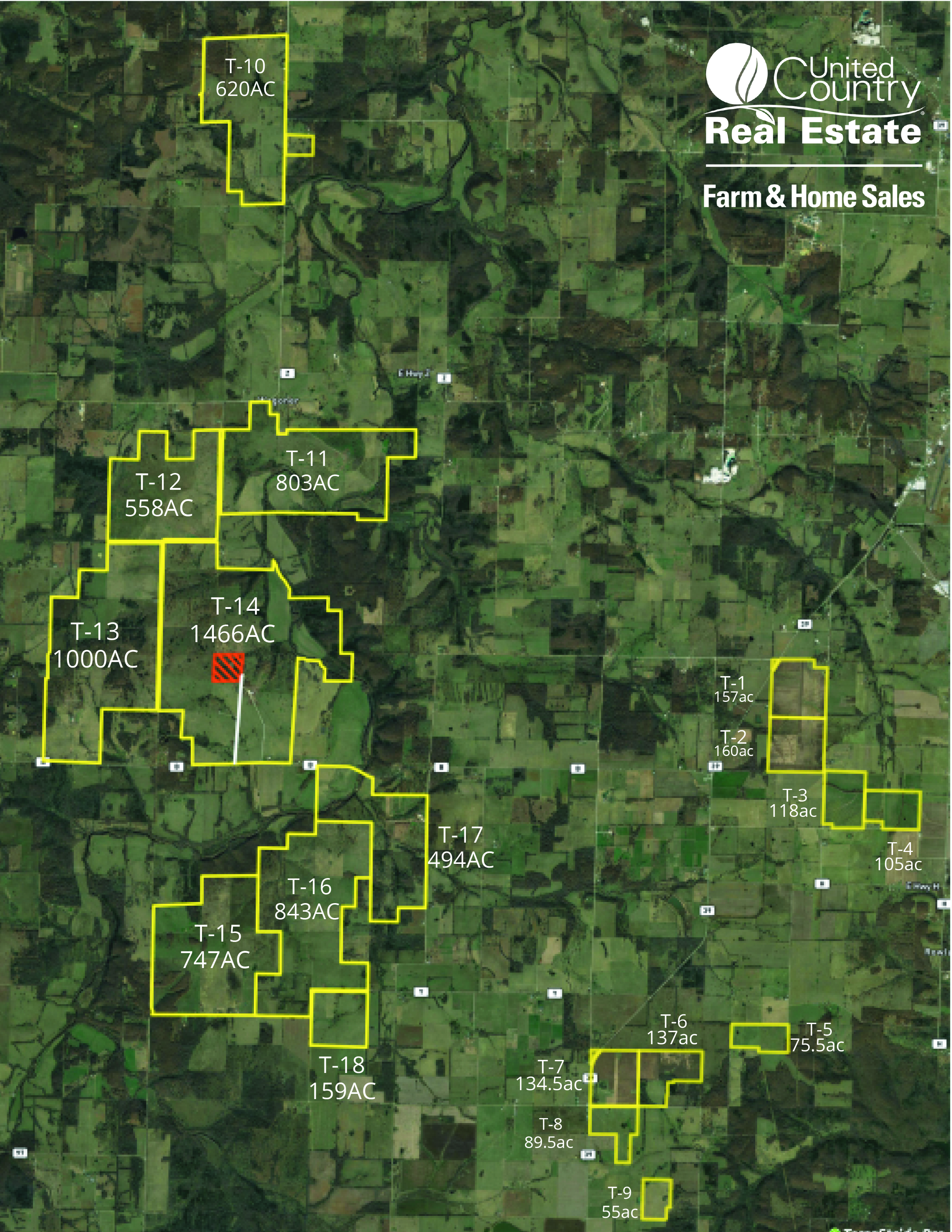 Circle A Ranch located just west of Stockton, Missouri has 6,621+/- acres of some of the finest land with a capacity of 2,400 cow/calf, and an additional 1,100+/- acres of row crop fields. The property is divided into 18 tracts and includes 5 ranch-style homes, multiple outbuildings, 2 feedlots, cross fenced pasture, and multiple working facilities. The ranch is set up with 11 different water wells, miles of buried water line supplying water to over 60 frost-free waters, miles of creeks, numerous springs, stocked ponds, and a 9-acre lake