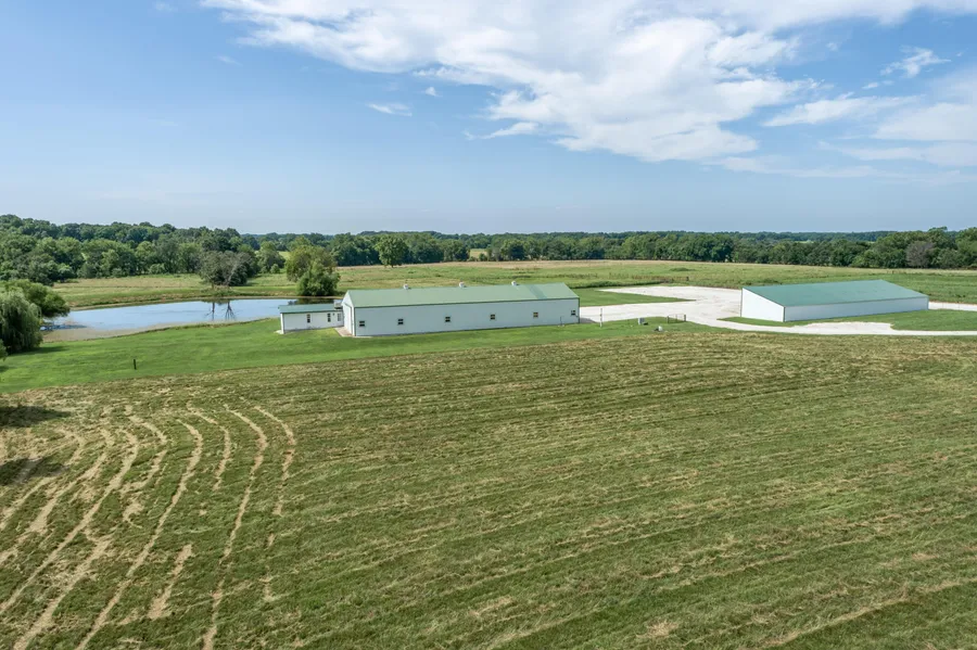 This great almost 12 acre property is conveniently located less than a 1/2 mile West of Hwy 32 between Stockton and Fairplay. The property features a 40'x120' main insulated building with smooth concrete floors, large overhead and sliding doors, office, kitchenette, customer restroom with dedicated septic and ductwork for HVAC. The attached 2500square foot living quarters is spacious and recently updated and offers new LG appliances including Washer and Dryer, Quartz counters, new cabinets, LVP flooring, custom build master shower with soaking tub, cedar closets, large living spaces and below grade storm shelter accessed by family room. The master bedroom has a great deck for enjoying the views of the pond located south of the living space. Adjacent to the main building is a 30'x100' three sided storage or equiptment building for plenty of storage space. Underground electricity supplied by Sac Osage Electric Coop. The 3/4 of an acre driveway and parking pad is layered with rock and ideal for parking heavy equipment. New fencing surrounds the property along with automatic waterer makes the property great for a small number of horses or livestock.