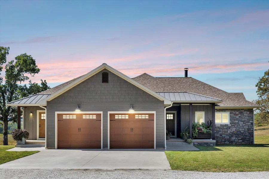 Set back from the road just off Highway 32, this property makes an immediate impression. A long, winding drive leads to a home positioned perfectly for privacy and sunsets every view from the main level or lower level captures the landscape in full.Built with exceptional quality, the home features exposed wood beams, a grand stone fireplace, and walls of windows that fill the space with natural light. The open floor plan connects the living, dining, and kitchen areas, creating a space that feels expansive, balanced, and refined.The primary suite includes his and hers baths and closets hers with a soaking tub and his with a walk-in shower. Every finish reflects thoughtful craftsmanship and solid construction from top to bottom.The lower level adds additional living space, bedrooms, and a workshop area, maintaining the same level of quality and detail as above.One of the standout features of the property is the horse barn a custom-built structure with a cypress exterior and cedar and fir finishes inside. It includes three stalls, a tack room that could double as a lounge, a half bath, and a loft for storage. It's exceptionally well done and adds tremendous appeal to the property.The acreage is fully fenced with a gentle roll, ready for livestock, offering a balanced mix of pasture and timber with a pond and automatic waterer.Located less than ten minutes from Stockton Lake, this property delivers on every level privacy, craftsmanship, and design that set it apart from anything else on the market.