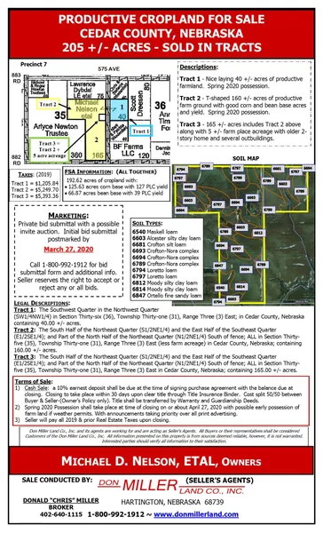 Tract 3: The South Half of the Northeast Quarter (S1/2 NE1/4) and the East Half of the Southeast Quarter (E1/2 SE1/4); and Part of the North Half of the Northeast Quarter (N1/2 NE1/4) South of fence; ALL in Section Thirty-five (35), Township Thirty-one (31), Range Three (3) East in Cedar County, Nebraska; containing 165.00 +/- acres.
