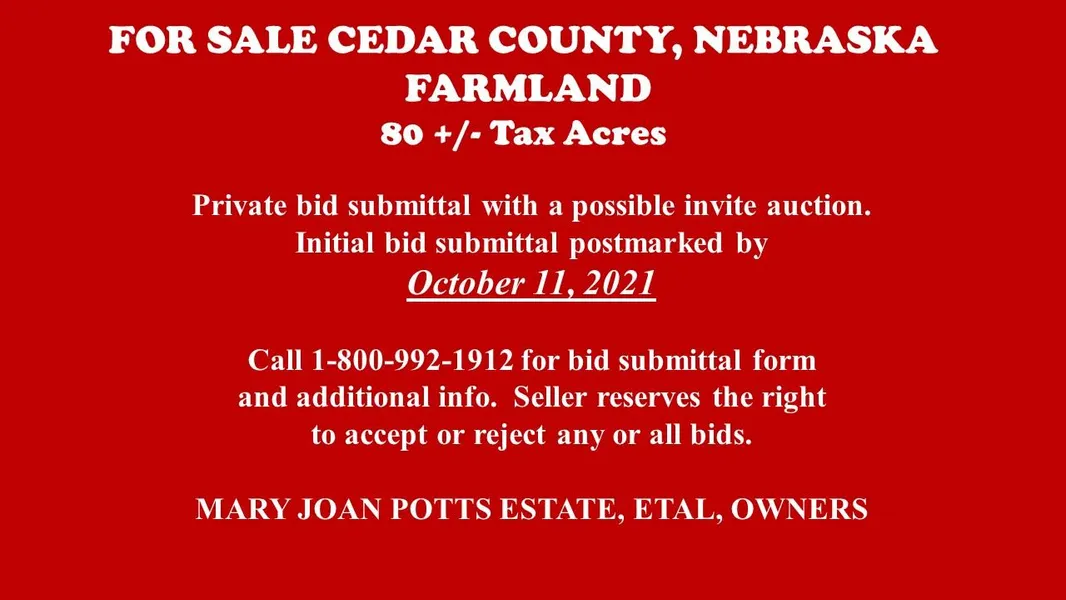 Private bid submittal with a possible invite auction. Initial bid submittal postmarked by October 11, 2021. Call 1-800-992-1912 for bid submittal form and additional info. Seller reserves the right to accept or reject any or all bids.