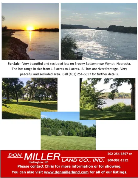 For Sale - Very beautiful and secluded lots on Brooky Bottom near Wynot, Nebraska. The lots range in size from 1.3 acres to 4 acres. All lots are river frontage. Very peaceful and secluded area.