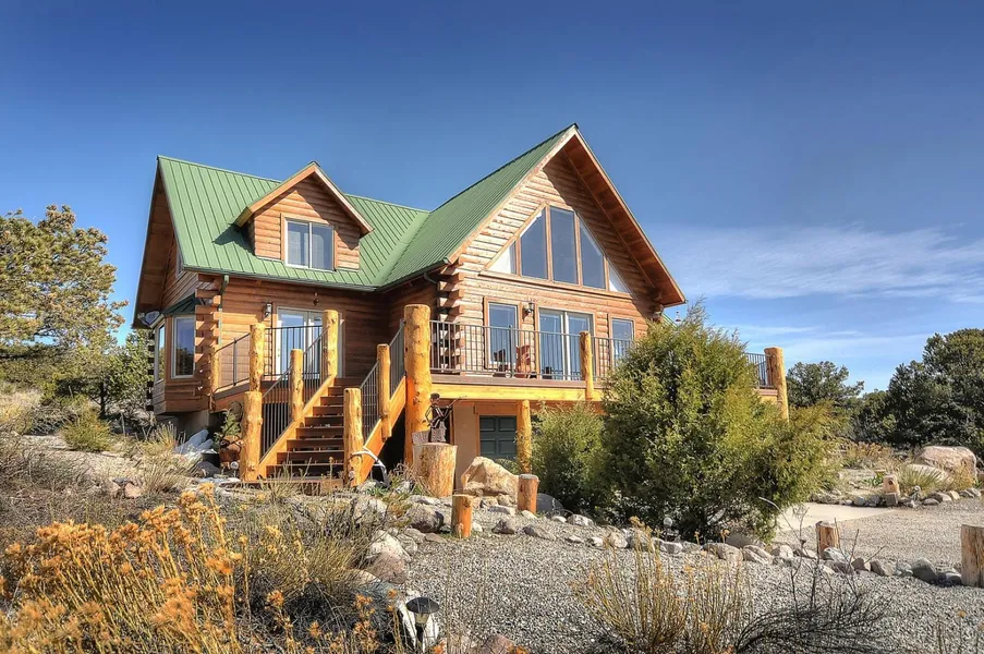 Gorgeous log mountain home! This beautiful home is architecturally designed and built on 43 acres. This property borders acres of public land. This private treed setting has 180-degree mountain and valley views. The home has 4 bedrooms, 3 bathrooms and an office with the master suite located on the main level and an attached 2 car garage. The home boasts beautiful vaulted aspen ceilings, open floor plan, floor to ceiling windows, hardwood ash flooring, open kitchen and dining with lots of light. Wonderful outdoor living space with incredible views and new evergreen decking. The land is heavily treed and private. This is Colorado Living!