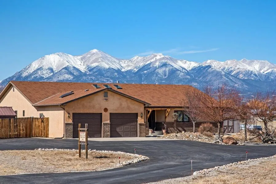 Rural living within two miles of downtown Salida, Colorado. 2971 square feet, 4 bedroom, 2.5 bath, one level home on 2.2 acres. Walk or bike to downtown Salida, Salida Golf Club, Arkansas River, and the Salida Trail System. Wide open mountain views in all directions from inside and out. Cul-de-sac location and large lot provide plenty of space and peaceful living in an established neighborhood. Well thought out open floor plan with a great flow, spacious rooms, and lots of storage. Large 4th bedroom can function as an office, family room, or recreation room. Oak trim and cabinets and built-ins throughout the home. Open updated kitchen leads to a great outdoor living space with a covered deck, fenced yard, two garden areas, small green house, sprinkler system, and big views of the surrounding mountains. Paved driveway from the street to the large concrete pad in front of the attached garage two car garage. Well maintained and ready to move in and add your personal touches.
