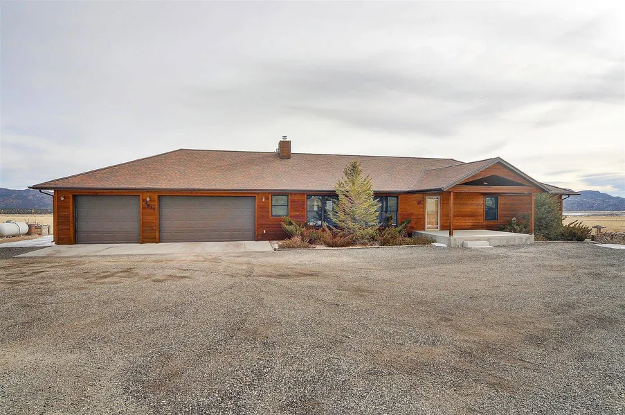 Attractive custom built home on 6.13 acres with unlimited views of snowcapped mountains in all directions! Desirable, open ranch style floorplan offers vaulted great room ceilings, oversize floor to ceiling windows to capture the Chalk Cliff views to the west and 3' wide doors with other accessible features throughout. Inviting living room has wood burning fireplace with blower and adjoining private office. Kitchen offers abundant storage, oversized pantry, moveable island and ample room for full size dining table. Spacious south facing master suite has sizable walk in closet with built in organizers and attached full bath with jetted tub. Thoughtful design includes two additional generous bedrooms plus the convenience of a second full bath. Incredible 1,235 sf, 3+ vehicle, insulated, heated attached garage has workshop with built-in shelving/storage and 220 electric. Exterior cedar sidi...
