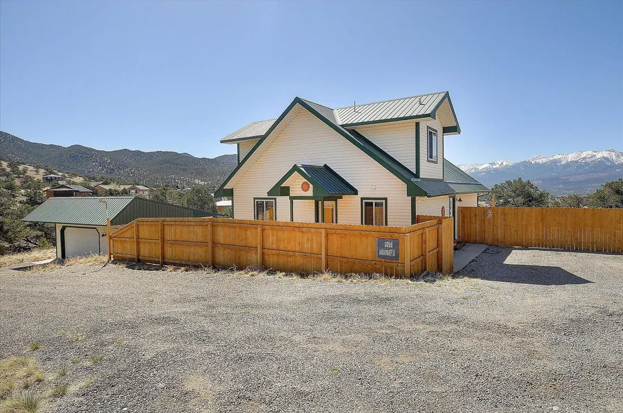 Location Location and beautiful mountain views. This lovely home on 1.4 acres is perched up perfectly to face the mountains with a private location toward the end of a cul-de-sac within the desirable neighborhood of Pinon Hills. Only three miles from historic downtown Salida, this home has been fully renovated to "move in condition". Vaulted ceilings, granite countertops, all new Maytag appliances, new flooring, remodeled kitchen and bathrooms, new cedar fencing, metal roof, new septic tank and a fresh coat of paint everywhere. The spacious kitchen boasts a large center island. This home has an open floor plan concept with plenty of windows to bring in the sunshine. The loft primary bedroom allows for great views, has plenty of space and a large attached full bath with double vanities. Great outdoor space to take in the views from the patio. Enjoy the quiet and stars at night from your new "Hot Springs" hot tub. The detached heated oversized 2 car garage includes a workshop space and plenty of cabinets for storage. The lot has plenty of space for an RV or camper with convenient clean out. Two private cedar fenced yard spaces. Close to fishing on the Arkansas river, hiking, biking, skiing and outdoor recreation. By appointment.