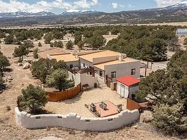 Discover serenity in this single-story southwestern haven set on FOUR acres, embraced by breathtaking mountain vistas. This 3-bed+den retreat seamlessly marries traditional warmth with modern elegance. Revel in an expansive garage, steps from the Arkansas River, minutes to Buena Vista and Salida. Unique touches abound - from custom gates to an outdoor kitchen with a pizza oven, a hot tub, and a Kiva fireplace. Enjoy handmade doors, in-wall speakers, an outdoor shower, and incredible mountain views. Your idyllic blend of nature and luxury awaits!