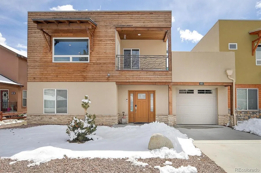 Zoned C-1, this property has been a successful short-term rental and income producing property since 2018. The townhome is thoughtfully designed and well maintained with four bedrooms and two 1/2 bathrooms. Three bedrooms are located on the first level, along with a laundry closet, access to the spacious outside fenced yard and the garage. One full bathroom with double sinks is also on the first level. Upstairs opens up to the living/dining/kitchen area which has been updated with visual accents bringing mountain living indoors. On this level is the primary bedroom with ensuite 3/4 bathroom and double sinks. An additional 1/2 bathroom is just off the kitchen. The kitchen has plenty of quartz counter space, tiled floor, a pantry and well-maintained appliances. Access to the roof top deck is off the main level where you can enjoy privacy, fresh air and mountain views. All of the bedrooms have generous closet space and room for plenty of bedroom furniture. This four-bedroom contemporary mountain home has a lot to offer and with it's C-1 zoning, the possibilities are endless.