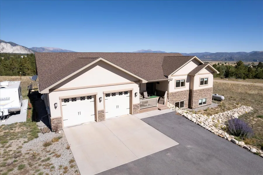 Nestled on a beautiful corner lot with stunning 360-degree mountain views, this 5-bedroom, 3.5-bathroom home offers both luxury and tranquility. Located in a peaceful, quiet neighborhood, the property features a 2-car garage and floor-to-ceiling windows that showcase breathtaking views of the Chalk Cliffs. The primary suite is on this main floor along with two more bedrooms and a shared full bath. An office with a closet could serve as a sixth bedroom, or just used as a den or study. The modern kitchen includes granite countertops and sleek appliances. There is a walk in pantry and nearby laundry room with a half bath. The spacious living areas are enhanced by warm hardwood floors. Plenty of room for gathering and taking in the big views. The home's exterior is an easy keeper built with durable stucco inlaid with natural stone. A carpeted, open basement offers a cozy cave with a gas fireplace, perfect for relaxing on chilly evenings. Two bedrooms are on this level with a full bathroom. This home offers so much space but still keeps a very cohesive feel throughout. With solar panels providing efficient energy, this home is eco-friendly and energy-efficient. The private backyard is ideal for outdoor gatherings or starting a small garden, making it a perfect blend of nature and modern living. We are excited to show you this extraordinary home!