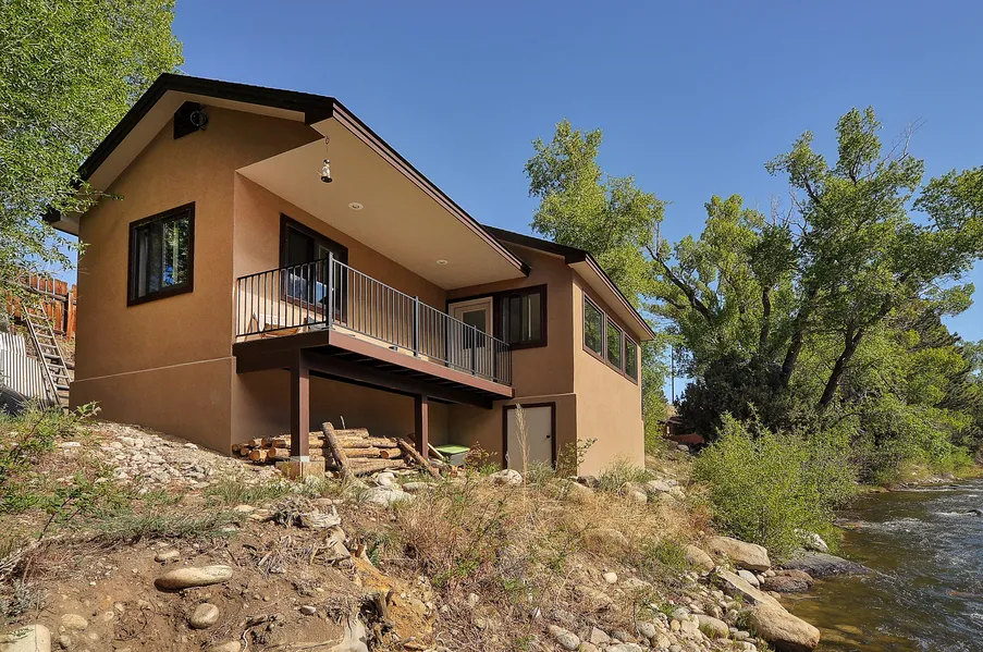 Incredible opportunity to own .87 acres directly overlooking the Arkansas River with East property boundary to the centerline of the river! Park like setting with two homes currently being utilized as month to month rentals. Ideal scenario for full/part time residence or short/long term rentals. 550 sf frame/stucco cottage was custom built in 2014 and has main level living with breathtaking views both up and down river. Vaulted ceilings, abundant windows and modern finishes including wood grain ceramic tile, maple kitchen cabinets with dovetailed drawers. Private deck for enjoying the sights and sounds of the river and 550 sf lower level storage area with plenty of room for gear. ICF foundation and electric radiant heat with individual thermostats. Washer/dryer unit included. Second home also has fabulous water views from the house and the covered ent...