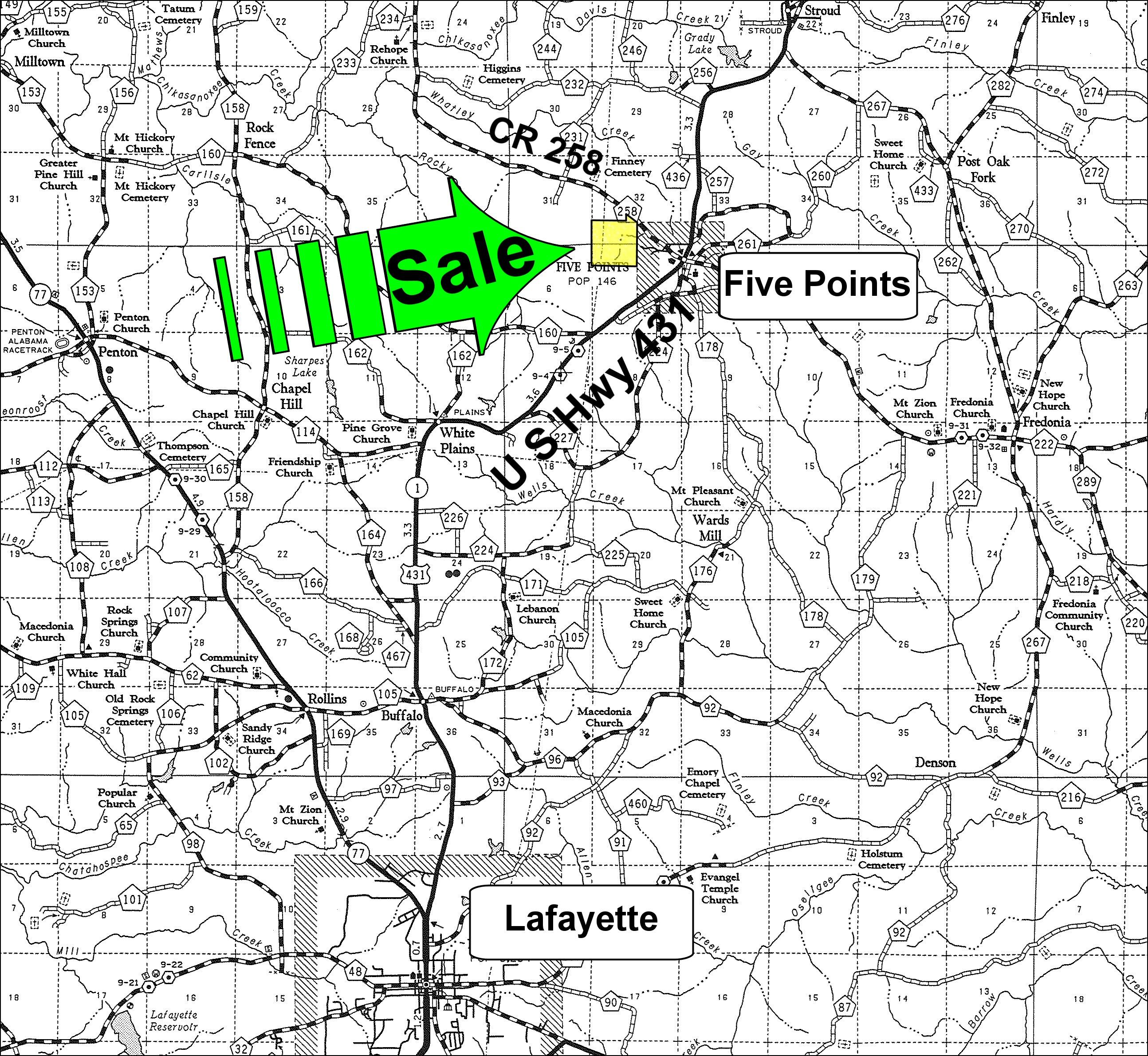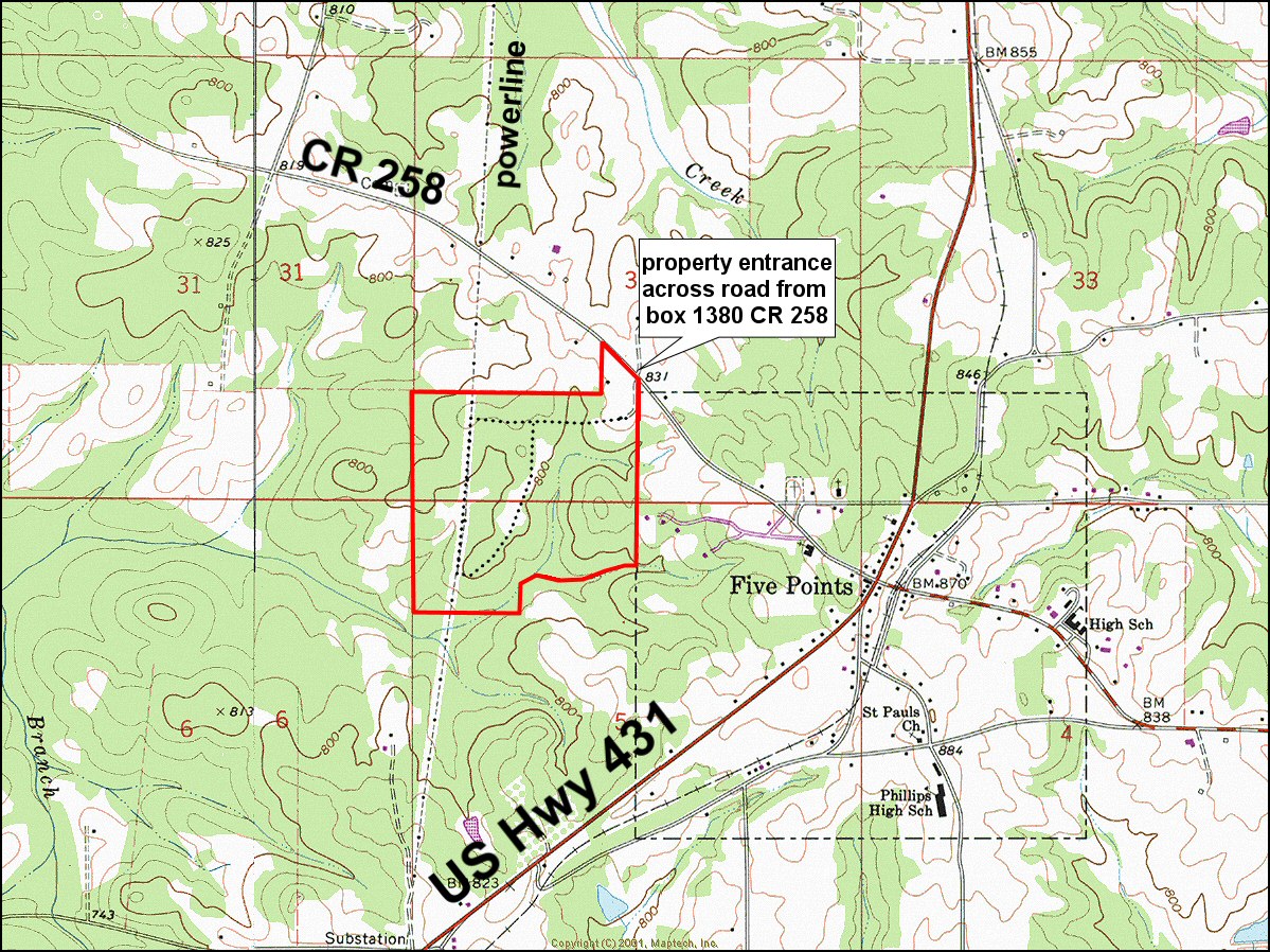 Research Parcel InformationExit I-85 at exit # 78 and take US Hwy 29 north. In one mile, take AL Hwy 50 west for 13 miles to US Hwy 431 in Lafayette. In Lafayette, take a right on US Hwy 431 north 10 miles to Five Points and the intersection of County Road 258 on the left. Take a left on County Road 258 and go ¾ miles to the access road on the left, across the road from Box 1380 County Road 258. There are no gates, so help yourself to drive the roads indicated on the topographic map.