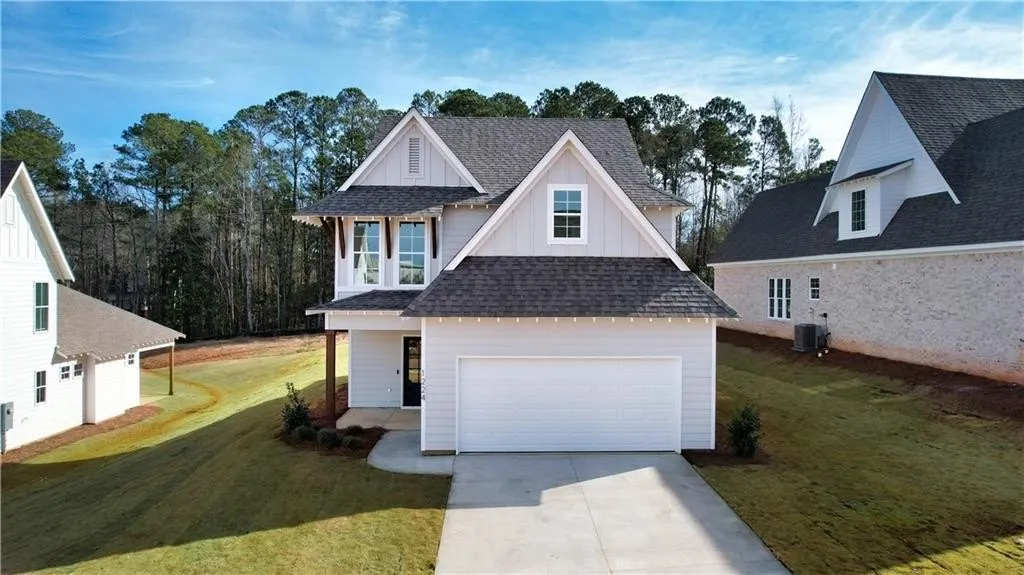 The Trapper is a four bedroom, two-and-a-half-bathroom home with double car garage, spanning across 2,073 square feet. Guests are greeted by a welcoming foyer which flows into the gourmet kitchen and dining area. The kitchen features a large center island and access to a powder bathroom and laundry room. The kitchen and dining area flow into the living room that features large windows and access to the covered back porch. The primary suite is tucked behind the living room and features a spacious bedroom, en-suite bathroom with a walk-in shower, double vanity sinks, and a walk-in closet. The second level of the home features three more bedrooms and a full bathroom.