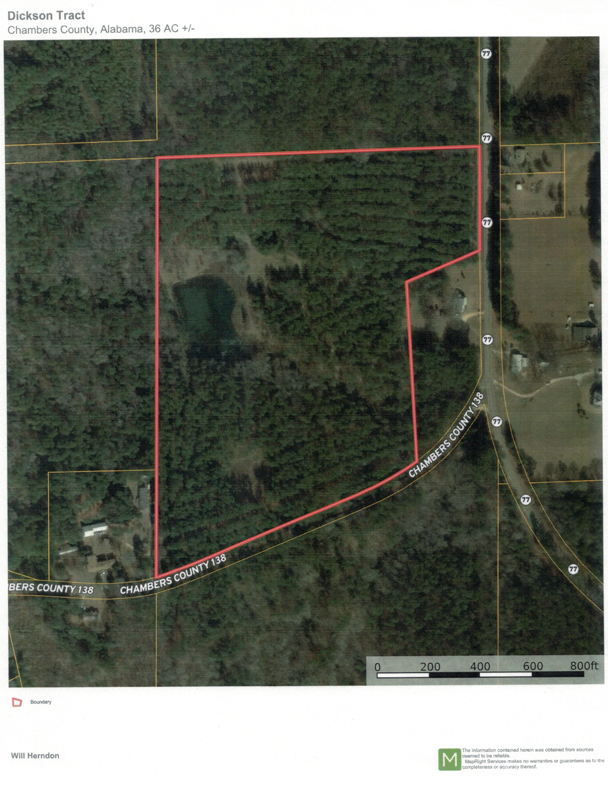 36 (+-) acres located on Highway 77 & County Road 138 just south of Wadley in Chambers County, AL and about 35 minutes from Opelika. This a super nice small hunting tract or a great place to build a home. There is a good stand of mature planted pine timber, two nice food plots and a 2 acre pond with bass and bream. If you like to duck hunt, I have seen wood ducks on the pond every time I have been there!