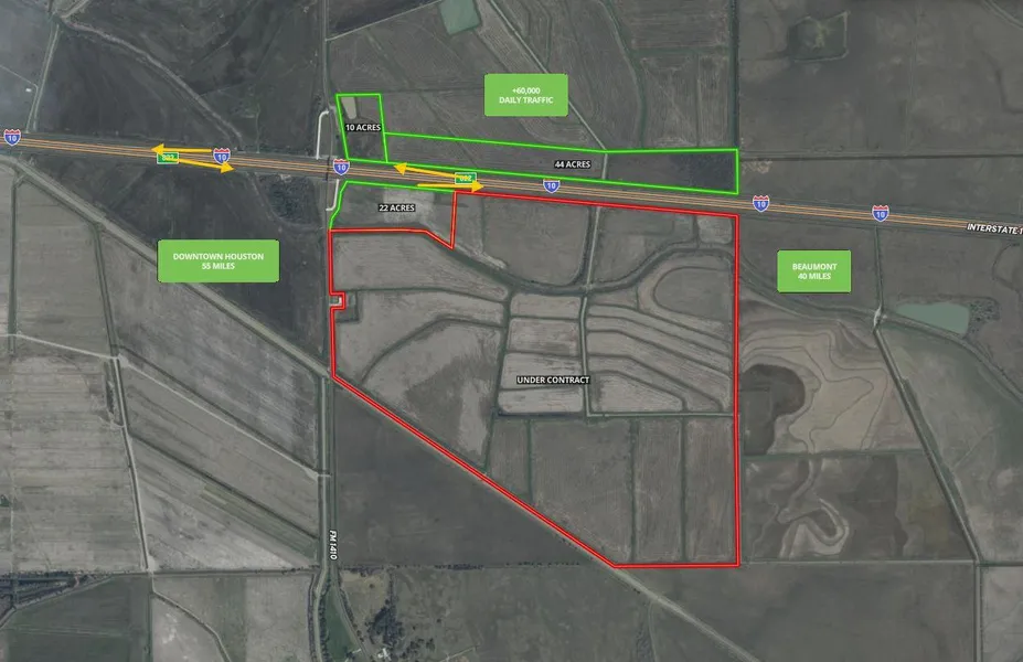 Prime development frontage on Interstate 10 and FM 1410 in Winnie, TX. These commercial tracts have exit and entrance ramps available on both sides of Interstate 10. The 10 acre tracts must be purchased wholly while the others can be broken up on a per needs basis. Electricity available. Contact Broker for pricing on each tract