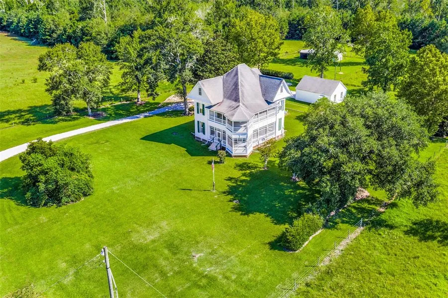 1901 Victorian Masterpiece was built by one of Chambers County's original settlers, John Claude Jackson. It is surrounded by 40-beautiful acres, 13-cleared and fenced. Original features include carved wood entry doors w/stained glass; high ceilings; pocket doors; wrap-around screened verandas on 1st & 2nd floors; floor to ceiling sash windows; gas log fireplace encased in marble; original hardwood floors; ornate staircase, and 3rd floor attic; Distinctive baseboards, door casings, and crown molding throughout. 2-car detached garage w/extra space for workshop/office. Barn w/additional parking for equipment. Come and experience this sanctuary for the Heart, Mind, and Soul. 30-minutes south of I-10 East. 30-minutes from the Bolivar Beach. This property could also be a perfect venue. WATCH THE VIDEO TOUR!!!!!