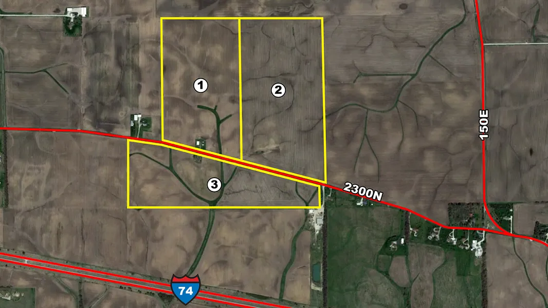 Travel west on US Highway 150 for 1.4 miles to County Road 200E/Turkey Farm Road/County Highway and turn right/north. Travel north on County Road 200E for 1.1 miles and as the road curves to the west and splits, continue west on County Road 2300N for 0.6 miles and the property will begin on your right.