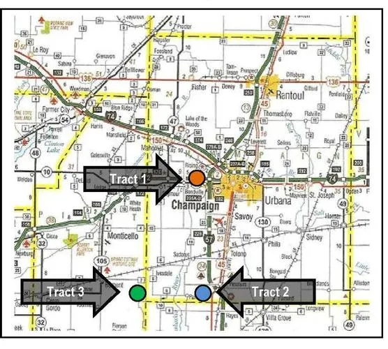 Research Parcel Information3 Parcels located west of Champaign. Tracts 1 and 2 in Champaign County, Tract 3 in Piatt County.