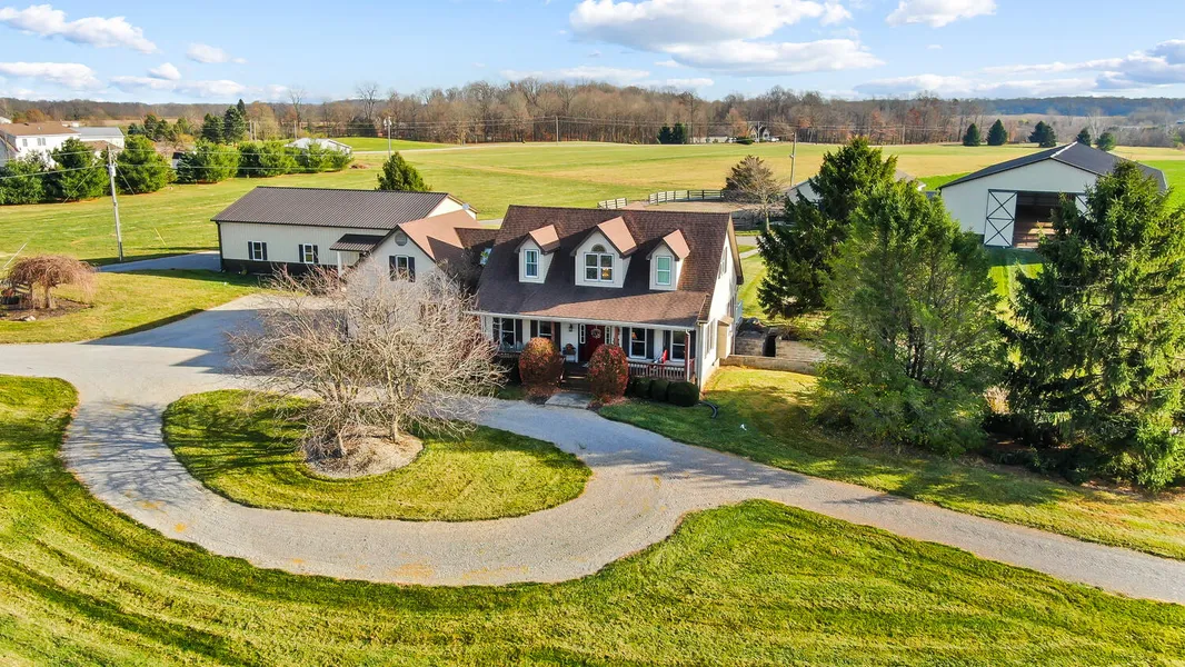Escape to your own private, 10 acre retreat with picturesque views! Classic cape cod style home with first floor primary suite and over 3,000 sq/ft of living space. Partially finished basement adds option of 4th bedroom. Spacious upstairs bonus room. Heated tandem garage/shop, as well as a traditional 2 car attached. Unwind on the large back deck with sunken hot tub. Overlook rolling hills, barns, and stocked 1 acre pond. Stamped concrete walkways for easy access to outbuildings. Amazing equine amenities! Beautiful 36'x60', six stall barn. Optional run ins to paddock and overhead feed drops for all stalls. Heated tack room with kitchenette and equiptment lockers. Breezeway to 60'x90' indoor riding arena with LED lighting and 16'x14' sliding doors to open for all season enjoyment. Landscaped patio for dining and entertaining. Horses enjoy 5 acres of fenced-in pasture. Additional parcel can be baled for grass hay. Need boat or camper storage? Secure them in the verstile 32'x60' shop area complete with concrete, electric, and 3 custom 12'x14' roll up doors. New ''barndominium'' outbuilding adds additional 1,000 sq/ft of living or office space (2 beds, 1 bath) and another oversized garage with water hookup and drains. Electric, plumbing, HVAC, and drywall to be complete and ready for your finishes. Geothermal heating/cooling. This dream property is less than an hour commute to both Columbus and Dayton. Make it yours!