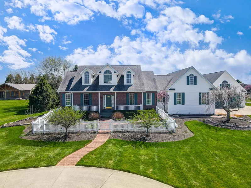 Custom built steel frame cape cod home with 3 bedrooms and 3.5 baths on 1.95 acres. It has over 4,300 square feet of living space. Large open entry with vaulted ceiling leads to dining room, den/office or straight into the great room which features vaulted ceiling built in shelving, decorative alcoves and a gas fireplace. The great room is open to the spacious kitchen with eat in area and breakfast bar. 1st floor owners suite with newly updated bath with tiled shower and soaking tub. Another bedroom, full bath, half bath and laundry complete the first floor. Upstairs you will find a large bedroom and and full bath. The basement has a huge family/ rec room and tons of storage. Large deck out back overlooks fenced yard area. 2 car attached side load garage and 56x30 additional garage w/loft. Updates include new flooring in office and main floor bedrooms and fresh paint. Water heater, water...