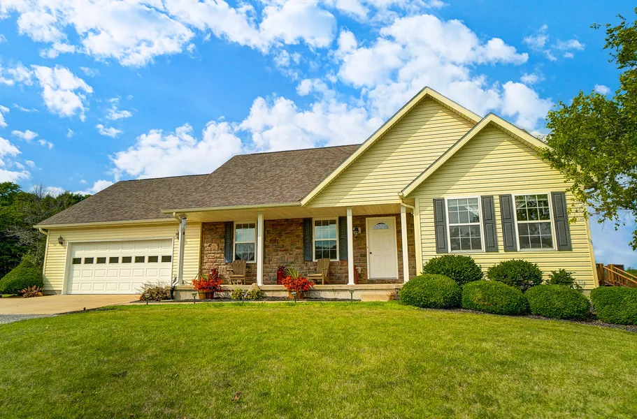 Lovely ranch with full walkout basement nestled on 7 acres has everything you'll need. Vaulted ceiling, oak doors and trim, and gas fireplace with granite hearth in the living room open to kitchen area with granite countertops and stainless appliances. Bedroom with en-suite bath, double vanity, jetted soaking tub and tiled shower and walk in closet with built ins, two more bedrooms, a full bath and laundry area are all in the main level. Not to mention a huge deck and above ground pool in the back. On the lower level there are 2 more bedrooms, full bath, a second gas fireplace, a family room, recreation room and lots of storage area. You can walk out from this level to a spacious patio with a hot tub. Gorgeous views in every direction. Pond with fountain out front and rolling hills to the side and back. Additional updates per the seller include: smart water heater (summer 2021), new well...