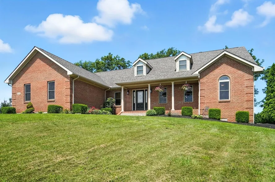Winding brick driveway lined with towering pines welcomes you to this meticulously maintained brick residence nestled on 4.98 scenic acres. Surrounded by mature trees, a wooded area, and a meandering stream, this property offers serene privacy with breathtaking views extending to open farmland beyond. The open floor plan features a spacious great room with fireplace, an eat-in kitchen, and formal dining area perfect for gatherings. The main level includes an owner's suite with private bath, walk-in closets, and direct access to the laundry room. A main-level den provides flexible living space for an office or guest room. Step out from the dining room or owner's suite onto the rear deck overlooking a peaceful backyard oasis, complete with a patio and retaining wall for added privacy. The finished walkout lower level surprises with a large 4th bedroom, expansive family room, and a full 3rd...
