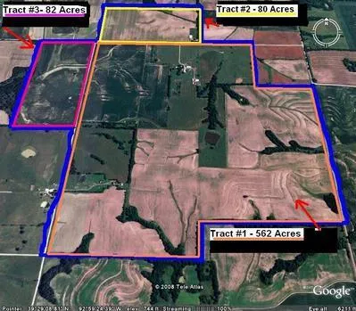 Exceptional Quality North Missouri Land Auction. Agnes L. Wolf Trust; Selling 725 Acres of land in 3 individual tracts including a 563 acre tract, 80 acre tract and an 82 acre tract. Tract #1-563 acres, m/l; good quality improved upland approx 70% under cultivation, balance in good pasture/hay; improvements include a good quality 2-story mansard style home, 3-Morton machine sheds, livestock buildings, over 40,000 bushels of grain storage, a beautiful farm. Tract #2 - 80 acres, m/l consisting of very gently rolling good quality farmland approx 90% tillable; improvments include nice 1-1/2 story home & large Morton Building. Tract #3 - 82 Acres, m/l, good quality upland & creek meadow farmland about 90% tillable. All 3 tracts separated only by roads; located along good quality gravel roads & blacktop. Tracts will be sold separately and will not be offered in combination.