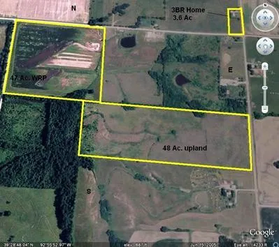 Waterfowl,Deer,Turkey; this has it all! Exceptional hunting property that includes a 47-acre developed wetland w/hi-volume well, electric pump, water control structure, 2-pit blinds w/dog boxes, elect. hookups for RV's; 48 acres upland farmland, grassland & brush adjoining w/premium deer & turkey hunting, tower blind included. Property Includes a nice 3BR 2Bath manufactured home w/26x32 detached 2-car garage/shop located along the Highway.
