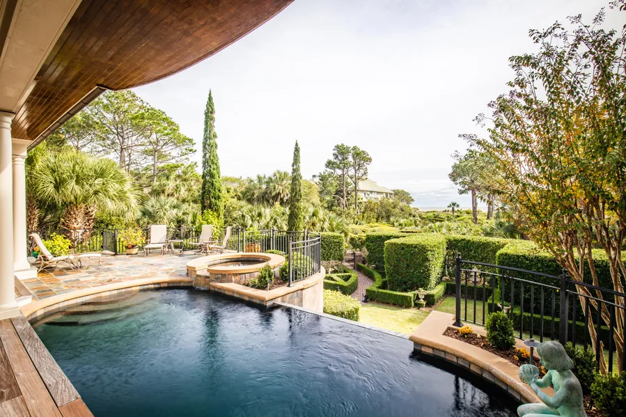 Located on Kiawah Island's most beautiful 10-mile, Atlantic Ocean beach, nestled among palm trees, venerable oaks, and crepe myrtles, stands this exceptional, 2-story waterfront home, offering wonderful ocean views/access, a tranquil lagoon, privacy and recreational opportunities. In addition to the infinity pool there is a beautifully manicured English garden. Generous in their proportions, the dining room and living room offer high, coffered ceilings and stunning millwork, redundant throughout the home. The kitchen's open design and ample storage will please any cook. The adjacent family room with fireplace informal eating area are a plus whether eating ''en famille'' or entertaining on a larger scale. Located off kitchen is a small screened porch housing a TEC kitchen with refrigerator, sink and high-powered grill. A cherry paneled study and private guest suite, laundry, wine closet and elevator round out the first floor. A spacious master suite dominates the second floor and includes a sitting room with exceptional views of the ocean, a large bath with tub and glass-walled shower, WC and access to well-ordered walk in closets. A large master bedroom and provides more expansive views of the ocean and beach. A 2nd story wood deck is accessed from both sitting room and master bedroom. Adjacent to two Jack-and-Jill family bedrooms is a small library/TV room which opens to a front balcony and views of the lagoon.