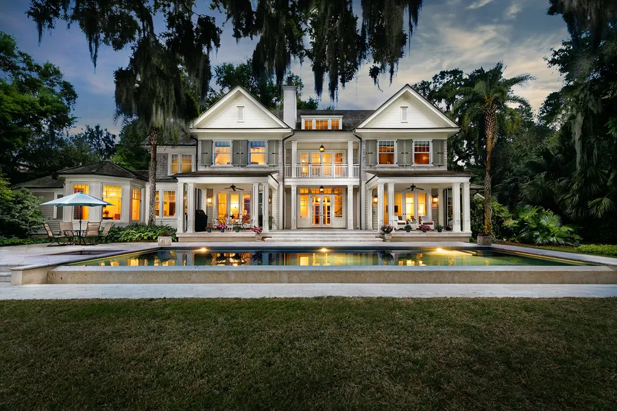 Outdoor living spaces blend seamlessly with impeccably designed interior finishes to frame the perfect Lowcountry lifestyle, sheltered from the bustle of town and always focused on the natural beauty of the waterways. With yards of ipe decking and stone patios surrounding the pool, the exterior is just as palatial as interior spaces. The stand-alone spa building is a striking feature with its wet bar and beverage fridge, steam room, powder room, open shower and sauna. The detached carriage house provides a comfortable retreat for longer term guests with separate entrance and full kitchen and even a washer/dryer.