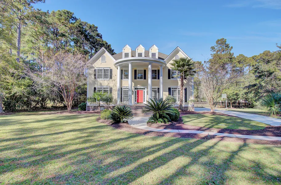 This impressive 5BD/4BA family home has all the gracious splendor one would expect to find behind the gates of Dunes West - and more. This distinctive, turn key, freshly painted inside/out home is situated on 1 acre and overlooking the 8th green of Dunes West golf course. Custom designed in Greek revival style, with massive Corinthian columns, bricked double stairway and eye-catching red door, the residence commands your attention. A long driveway with multiple parking spaces and 3 car garage easily accommodates a family of cars. You pass the tiered fountain and meticulously manicured front lawn to enter into a grand 2-story black and white checkered marble and granite foyer entry. Stunning.The owner spared no expense in the finer details, showcasing custom trim (moldings, baseboards, etc.) throughout the house. A formal office with custom bookshelves and French doors is followed by a formal dining room. The 2 story great room is open and filled with light from the Travertine tile floor to 2nd story ceiling windows that expanse the back wall. A must see is the tiled screened back porch, massive deck with lighted covered pergola, mature trees, large fenced backyard and superbly manicured exterior that rivals the front for attention. The great room feels grand and inviting, ideal for those who enjoy entertaining family and friends. The gourmet kitchen includes custom maple cabinetry, electric cooktop, built-in wall oven and microwave, and stainless steel appliances that complement the granite countertops and refinished wood floors. A custom wet bar with wine rack sits next to one of the 2 walk-in pantries, this one outfitted with custom compactor and built in cabinetry. The first floor also features a guest bedroom with full bath off the great room. The 2nd floor features 4 bedrooms and opens to overlook the 1st floor entry. At the top of the spindled wood stairwell are 2 bedrooms sharing a Jack and Jill bath. One of the bedrooms has a customized closet that would allow this room to be converted into an office. Bedroom 3 upstairs is spacious, filled with natural light, and features a private bath and walk-in closet. The owner's suite is a wing of its own, with custom double crowned trayed ceiling and double walk in closets. The owner's bath features separate dual vanities, tiled walk in shower and jetted garden tub. The owner's suite includes a private room overlooking the back yard that is accessed from the owner's bath that could be used for a 3rd walk in closet, work out room, or sitting room. The 3rd floor is fully finished for you to create your own game and/or media room. The possibilities are endless!