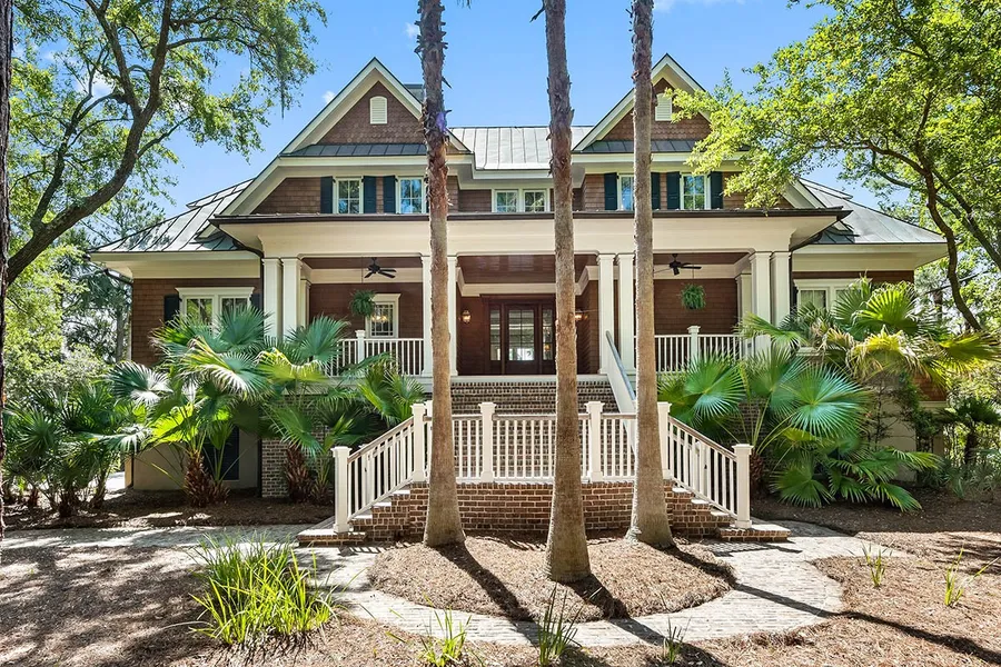 Located in the heart of the Preserve on the island’s eastern end is 208 Chinaberry Lane. Set in the midst of native plantings and lush palm trees is a charming low country island home with three bedroom suites, den, family room and more. The natural stained cedar shingles are accented with Charleston oreen painted shutters, a standing-seam copper roof and wide front porch trimmed in summer white. A brick Charleston split-staircase invites you to step inside through a wood panel door framed with glass on both sides.