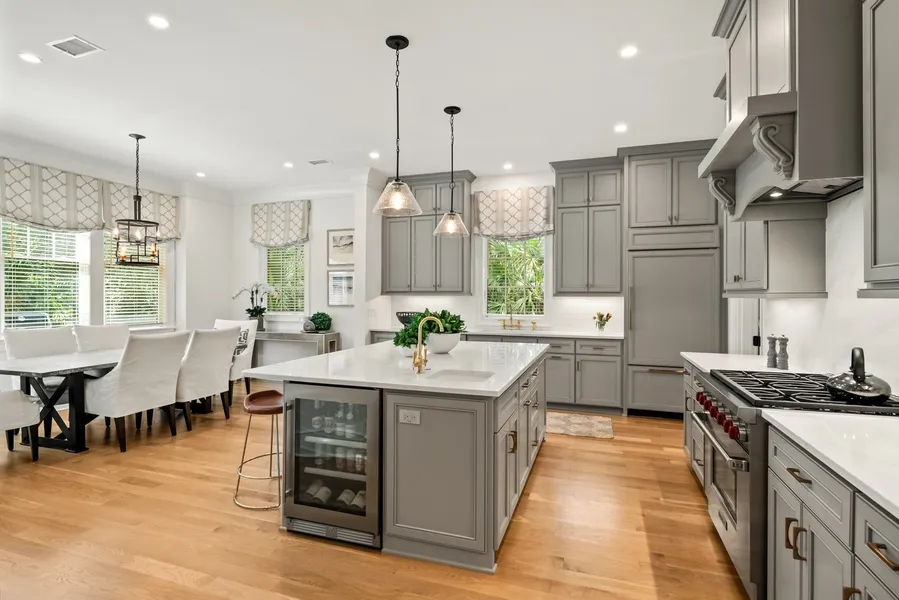The kitchen is adjacent, featuring quartz countertops, custom cabinetry, and integrated panels hiding the Sub-Zero® refrigerator/freezer and Bosch® dishwasher. The kitchen also includes a Wolf® gas range with oven, Sharp® microwave and XO® beverage cooler. A walk-in pantry offers additional storage, while the dining area, surrounded by windows, opens onto the deck for meals overlooking the pool.