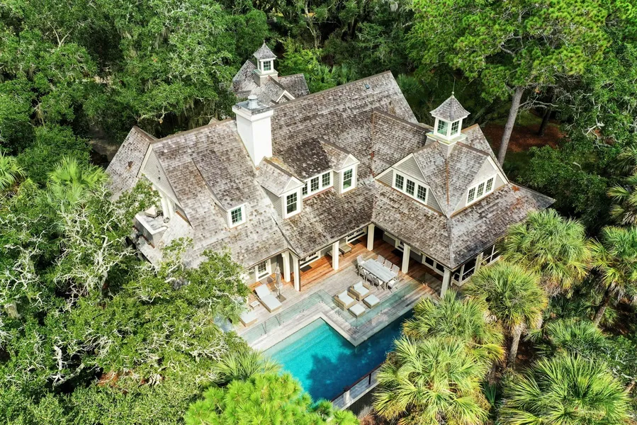 This Mark Finlay-designed shingle-style home, topped by a cedar-shingle roof and twin cupolas—crowning both the residence and its many-dormered garage wing reminiscent of a historic carriage house—also enjoys an in-deck pool with a lap pool portion, spotlessly glassed in for the safety of visiting children, a covered rear terrace, and a large screened porch overlooking the marsh.
