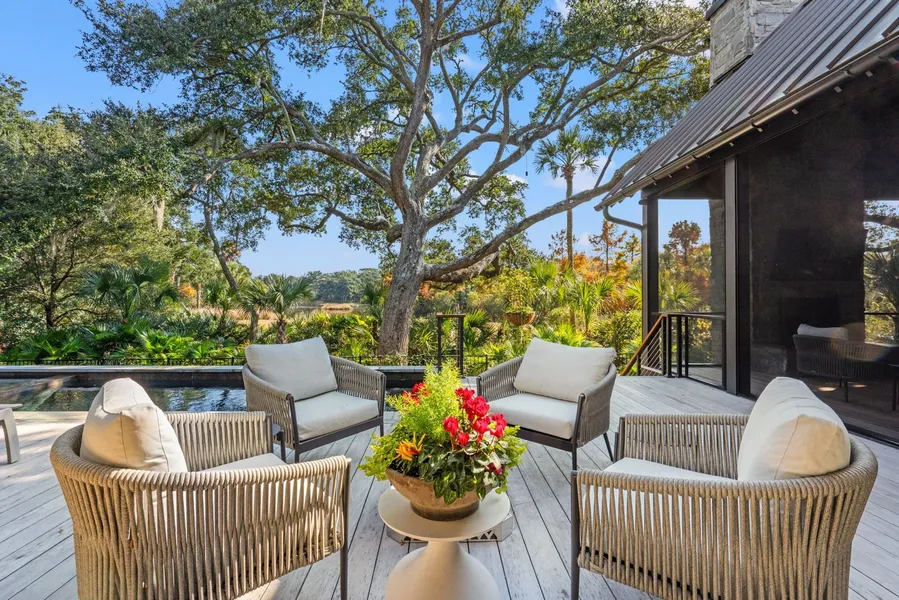 The recently built home at 435 Fountain Grass Lane features serene water views at Kiawah’s easternmost tip. Rich in outdoor living spaces, this modern, window-lined home enjoys a heated saltwater pool, outdoor fireplace and firepit, and summer kitchen beside an Island lagoon.