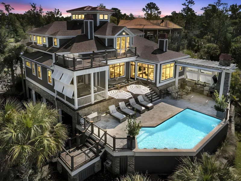 Deep-Water Low Country Oasis nestled on 1.55 Acres! Experience the best in Charleston living with this one-of-a-kind private gem. This breathtaking custom-built estate offers the perfect blend of modern elegance and waterfront living. This home offers the epitome of living on the Wando River, including breathtaking views and stunning sunsets. The true deep-water covered dock is complete with: WIFI access, custom lighting, a 10,000 lb boat lift and large floater. Upon entering the home, you are welcomed with panoramic views of the scenic Wando River, hickory floors throughout and large windows that allow natural light to flood the space. The open concept gourmet kitchen and living rooms showcase: a large island, stainless appliancea new 48-inch LG refrigerator, full wine cooler, Wolf gas range/ovens and a wine bar. The master bedroom is on this level, complete with a cozy gas fireplace. Step into the connecting ensuite, where finishes include an oversize walk-in shower that then opens to a large, boutique-style walk in closet. Recently finished, it features a sophisticated organizational system, chic lighting and laundry facilities. The upper floor showcases three smart bedrooms, each paired with its own full bathroom. All are conveniently located adjacent to the second laundry room, with its expansive folding table. Follow the spiral staircase up to a hidden additional loft style room, cozy enough for a great book or to catch the bird's eye views of the Wando. The light-filled garage level is the ideal man cave! It includes a movie/game room with an 84inch TV/surround sound, full bathroom, detailed mudroom, automotive workshop, gym, and substantial space for storage. All heated and cooled and fully insurable. A full-size elevator accesses all floors of the home. Step outside to experience the elevated outdoor oasis, complete with a stunning rectangular saltwater heated pool, travertine tile throughout, a fully equipped built-in outdoor kitchen with cooktop, and gas grill. Additional improvements include: a full home gas powered generator, a completely fenced yard, two retractable poolside awnings for added shade, and a mosquito spraying abatement system. A charming short walkway leads right out to the dock.