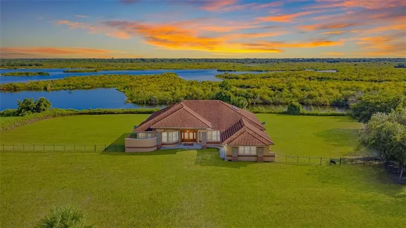 STUNNING 3 bed 2.5 bath plus den WATERFRONT home boasts over 3000 square feet of living space under air and 300 feet on the water! Situated on 10.3 acres, this secluded luxury estate is truly one of a kind. As you walk through the double entry doors, you will be welcomed into an open and split floor plan with two spacious great rooms, a formal dining room, and a large den. Every room has its own splash of vibrant color with custom details. The well-appointed kitchen features beautiful granite countertops, plenty of cabinets for storage, a walk-in pantry, a large center island and a breakfast nook with amazing views of the waterways beyond. As you enter the master suite, you will enjoy views of the water as well as private access to the lanai. The master bedroom has a spacious walk-in closet and leads to your luxurious master bathroom with a gorgeous vanity featuring granite countertops with dual sinks, a Jacuzzi tub, & walk in shower. The two large guest bedrooms are on the opposite side of the home, allowing privacy for your guests. Enjoy spending time on the over-sized waterfront veranda and living the Florida life with plenty of wildlife to entertain you. The home features an interior laundry room with a sink & storage cabinets, a spacious 2 car garage, fenced yard, water conditioning system, and a solar hot water heater. This incredible estate has endless possibilities! Owner financing available with sufficient down payment.