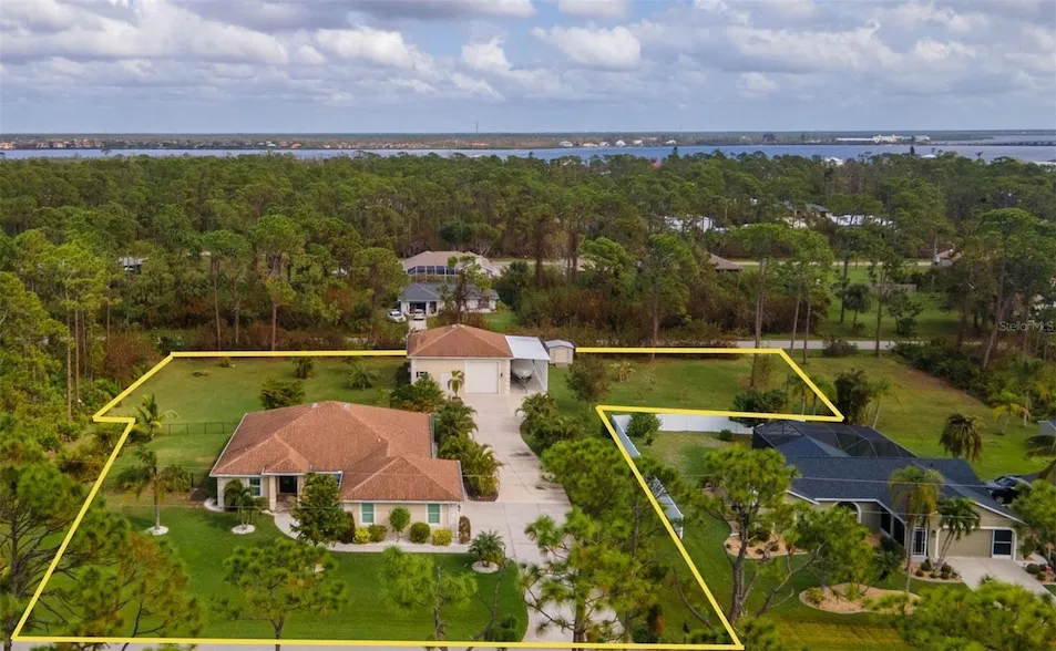 One or more photo(s) has been virtually staged. This property has it all! This luxury retreat sits on OVER AN ACRE in Gulf Cove and includes BOTH AN ATTACHED AND DETACHED GARAGE for you to park ALL your vehicles and toys, along with an RV carport! Plus, MULTIPLE SHEDS and OFFICES on the property will give you all the extra space you need. Your stunning home is filled to the brim with CUSTOM FEATURES to make you the envy of all your friends and family! Be sure to view the Custom Features Sheet for a FULL LIST OF UPGRADES!Step inside and be welcomed by the WOOD FLOORING underfoot and the grandeur of CATHEDRAL CEILINGS above. The gourmet kitchen is a chef s dream, featuring QUARTZ COUNTERTOPS, PULL-OUT DRAWERS, and SOFT-CLOSE CABINETS for a refined touch. Equipped with a three-compartment sink, stainless steel appliances, built-in microwave, and an ITALIAN GAS RANGE WITH CENTER GRIDDLE. Ample cabinetry offers abundant storage, while UNDER-CABINET LIGHTING creates the perfect warm ambiance. Use your DRY BAR to mix your favorite drinks or make it your own coffee bar. You have the option to serve your meals at the convenient BREAKFAST BAR or formal dining room where they can relax and savor your cuisine. Your PRIMARY SUITE allows you to unwind in a private sanctuary, featuring TRAY CEILINGS, a spacious WALK-IN CLOSET, and elegant FRENCH DOORS to the lanai. The en-suite bathroom offers a spa-like haven with a HEATED BIDET TOILET and a TOWEL WARMER for added comfort. DUAL SINKS set in quartz countertops and a stunning walk-in shower, complete with a custom backsplash and a built-in bench, invites you to rejuvenate in style. Your guests will feel right at home with a fancy GLASS POCKET DOOR to close off their two guest bedrooms. One bedroom features a double built-in closet, while the other boasts a spacious walk-in closet that could easily double as a sewing or craft space. Finally, your HOME OFFICE can be used for personal hobbies or professional work while you close the FRENCH DOORS for added privacy. Invite your guests outside to relax in the DESIGNER SCREENED-IN LANAI, a perfect spot for lounging and entertaining in the fresh air. A 50x50 SIDE FENCED DOG RUN provides a safe and comfortable space for your pets with a WROUGHT IRON FENCE facing the front. A walkway leads to your impressive 36' x 40' DETACHED GARAGE with a FULL BATHROOM and ample space to accommodate UP TO FIVE CARS or even a CLASS C RV. Inside, you ll find a PRIVATE OFFICE, a dedicated WORKSHOP AREA, and abundant storage shelves, making it as versatile as it is spacious. Plus, an RV carport with a 50 AMP hookup that accommodates a Class A motorhome makes this property ideal for those with a boat, RV, or car collection. The CARPORT'S CONCRETE SLAB WAS POURED WITH FOOTERS, reducing the cost of enclosing this area. And for added convenience, you have access to your rear storage from inside the detached garage and a separate GARDEN SHED is ready to store all your lawn tools!Located in scenic Gulf Cove, join an optional HOA to take advantage of their PRIVATE BOAT RAMP FOR LARGE BOATS and park only about a mile away will take you directly to the Gulf of Mexico! You will have easy access to 776 and a variety of shopping & dining options. Travel to numerous golf courses, or head to area beaches by heading south to Boca Grande or west to Englewood and Manasota Beaches. Experience 2 MAJOR LEAGUE BASEBALL SPRING TRAINING STADIUMS nearby. Call now to schedule a showing before your Florida dream home passes you by!