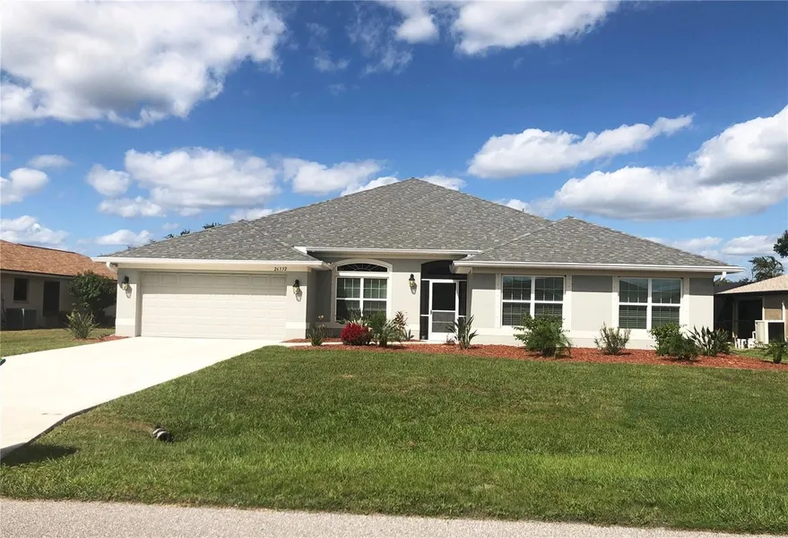 Spacious and impressive 4 Bedroom, 3 Bathroom home with attached 2 Car Garage perfect for a family or those expecting lots of winter visitors. *Built in 2021* Located in a quiet neighborhood in the desirable deed restricted community of DEEP CREEK. NOT in a flood zone. This light and bright home offers an open floor plan with Foyer with transom window and hall closet, separate Dining Room, Great Room, large well appointed Kitchen with Dining Area, Inside Laundry and 37x12 screened Lanai. The Great Room features a vaulted ceiling, luxury vinyl plank flooring, and French doors to the Lanai. The spacious Dining Room has a tray ceiling and lots of natural light through a large window and transom window. The Kitchen offers custom cabinetry with crown molding, tray ceiling, generous counter and cabinet space, large walk in pantry closet, stainless French door refrigerator, microwave, oven/range, disposal, double sink and island with breakfast bar. The Dining Area has a large window overlooking the screened Lanai and Greenbelt. Currently this area is being used as an office. The Inside Laundry has a front loading washer, front loading dryer, shelf, laundry tub and door to the Lanai. The Master Bedroom suite is huge and offers a tray ceiling, two walk in closets and private bathroom with dual sinks, large walk in shower and soaking tub. There are three additional generous sized bedrooms and two additional bathrooms, one with a new beautifully tiled walk in shower and the other with a tub/shower combo. Your living space extends through French doors in the Great Room to the expansive screened lanai with two ceiling fans and greenbelt view and is plumbed for a summer/outdoor kitchen. The backyard is fenced, perfect for your family and pets. This home is only two years old which means the roof, HVAC, appliances, etc are only two years old. Other features include screened front entry, rain gutters, landscaping, high ceilings, hurricane shutters and hurricane garage door. Luxury Vinyl Plank flooring throughout the living areas and carpet in the bedrooms. This home is located about 3 minutes from Deep Creek Golf Club and 10 minutes from shopping, dining, I-75, entertainment. Short drive to medical care, waterfront parks, boat ramps, fishing piers. This is a beautiful home in a great community!
