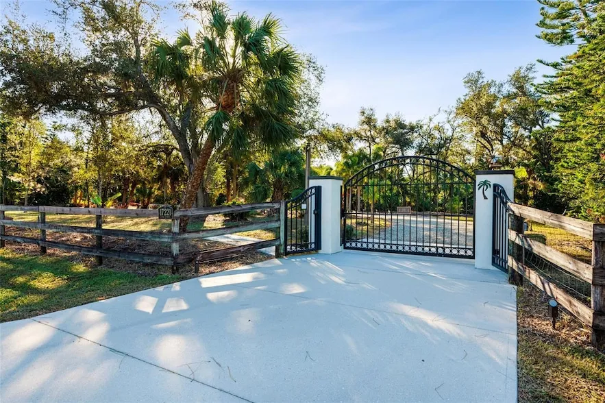 Resort-Style Living on Nearly 2 Acres of Tropical Paradise! Welcome to your private sanctuary, offering the best of luxury and practicality. This custom-built property is surrounded by lush, mature palms and tropical landscaping, fully fenced for security and accessed via a private entry gate. The resort style estate includes a main home with 2 car tandem garage and a separate detached guest apt with 1 car garage perfectly designed for privacy, entertaining, and versatile living. Spacious Design: Open floor plan featuring a living room, dining room, and bright office/den with custom wood cabinetry. 2 Bedrooms & 2 Baths: Master suite with lighted tray ceiling, sliders to the pool, custom walk-in closet, and a marble-and-granite bathroom featuring a dual-head walk-in shower, soaking tub, and double vanity. Split-plan second bedroom with easy access to the second full bathroom. Gourmet Kitchen: Thomasville 42 cabinets with pull-out drawers, stainless steel appliances, large pantry, and tube skylight for natural lighting. High-Quality Features: 12 ceilings with crown molding. Hurricane-impact windows and sliders. Metal roof, insulated block construction, and underground utilities. deep artesian well with updated equipment (2020). Security camera system and exterior lighting. Outdoor Oasis: Heated Saltwater Pool: Grotto spa, waterfall, and sundeck with pavers, all enclosed within a screened lanai. Outdoor Kitchen & Bar: Wood-burning pizza oven, stainless-steel grill, sink, refrigerator, storage, and Dekton countertops. Herb garden and adjacent custom pergola with lighting and fan. Additional screened in pavers patio by front entry. Separate Guest Suite/Building (Built in 2014) 940 sq. ft. of Possibilities: Living area w/French Doors accessing a private patio, a kitchenette, bedroom, full bathroom including marble shower, wet bar, laundry and garage. Metal roof, 10 ceilings, foam insulation, and its own septic and electric meter. Private entrance, fully air-conditioned perfect for a guests, workshop, office, or recreational space. Pathways to pool, tiki bar, outdoor kitchen & beautiful grounds. Additional Highlights: Main Home Garage: Tandem setup, 38 ft in length with a 7,000 lb asymmetric auto lift and separate electric meter and an air-conditioned storage room off garage ideal for your Harley Davidson room. Extras: 5HP Dayton commercial compressor. Car canopy. Tiki bar, fire pit, windmill, and garden arbor, New A/C installed Nov 2024 with 12 yr transferrable warranty Parking: Ample space for RVs with electric & water with compressor, boats & trailers. The Rear of property faces South and it backs up to Fallkirk Ave for additional rear parking and rear gate access and the front of the property enters on Elder Ave with private gate access. Convenient Location: Only 3 miles from major retailers, dining, and Port Charlotte Town Center. Minutes from medical offices, three hospitals (including a VA Clinic), and I-75. Located in FEMA Zone X, reducing the need for flood insurance. This property is an entertainer s dream and a private haven. With no HOA and endless possibilities for both the main home and separate building on nearly 2 private acres of true beloved tropical botanical gardens with birds and butterflies, while living close to nature, it offers a rare combination of resort-style living and practical versatility. Please see the two picture tours linked including floor plans
