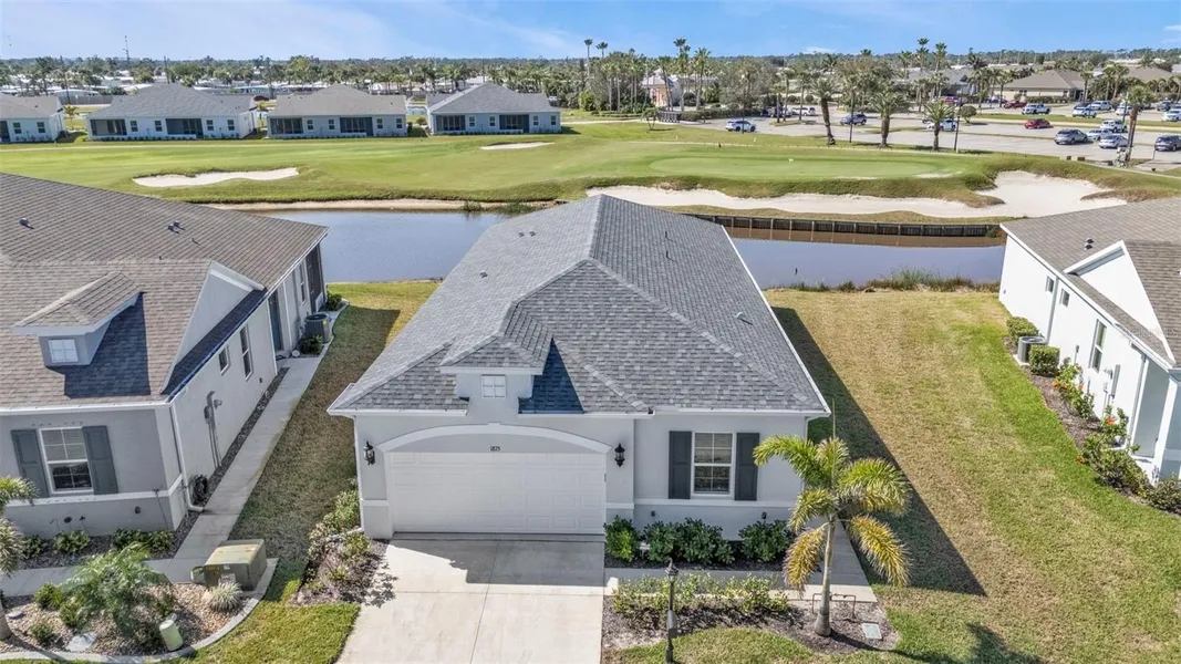 SUPER RARE SINGLE VILLA built in 2023 with an AMAZING VIEW of water and the 18th green available in the HIGHLY DESIRABLE golf course/active resort of KINGS GATE, a 55+ community that is NOT in a flood zone and in evacuation zone d (have never been under evacuation order). ENJOY the best of both worlds - with the nearly maintenance free living of the villas combined with the privacy of a single home. Lots of updated features throughout this home - quartz kitchen counters, porcelain tile throughout, impact windows, murphy bed/desk/wall, epoxy garage floor and more. Built in 2023 you still get to enjoy everything being like new (AC, Roof, appliances). Photos don't do this villa justice - come and experience the villa and that view first hand. The open concept floor plan is loved by many - with kitchen, dining room, living room and lanai all seamlessly connected. Off the dining room is the o...