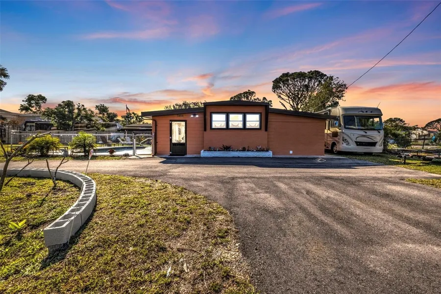 This immaculate POOL HOME in a prime location just minutes from the beach has been COMPLETELY RENOVATED inside and out and sits on an oversized 84 x 130 lot with circle driveway for easy parking. A NEW MEMBRANE ROOF was just installed, complementing the recently added HURRICANE IMPACT WINDOWS on the east side. Every room has been meticulously updated with thoughtful design and high-quality finishes, transforming this property into a 4-bedroom, 2-bath retreat. The open-concept floor plan seamlessly connects the kitchen, dining, and living areas, creating a bright and airy space perfect for entertaining. Step outside to your private paradise, where you can take a dip in the in-ground pool and then unwind under the outdoor pergola. The primary suite boasts a beautifully updated bathroom with custom tile work, a marble-top vanity, and a stylish tub enclosure. This home comes mostly furnished—just bring your toothbrush and move right in! NO HOA or CDD fees to keep expenses low. NO FLOODING with recent storms. Plenty of space to park your boat or RV west side and a large backyard with views of an illuminated lake fountain from the pool at night. Located just minutes from the stunning beaches of Manasota Key and Boca Grande, this area offers world-class fishing, boating, golf courses, nature trails, shopping, and dining. A must-see property—schedule your showing today!