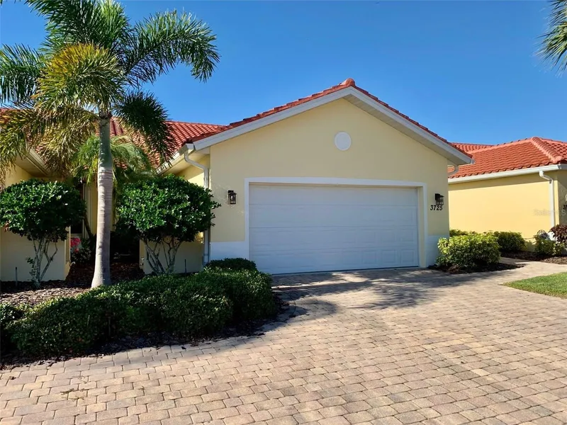 Live in Style at Villas at Burnt Store Isles: Spacious 2 bedroom, 2 bath with Den that can be used as a 3rd. bedroom, office or playroom. This home features an OPEN FLOOR PLAN with TALL vaulted ceilings: Custom plant shelving, a fold up Bookshelf that is a Murphy Bed in the Office/Den. This room can be used for guests when not using an office or family room/Playroom. Ceramic tile throughout. Clean garage has a wash tub Sink and a pull-down ladder to the attic. Large eat in Kitchen has all the updated appliances such as Glass Top Stove, Over the Hood Microwave Oven, Dishwasher, refrigerator with ice maker, granite countertops and plenty of storage. The laundry room has washer/dryer and is very spacious. Kitchen, hallways, bathrooms & Laundry Room have Ceramic Tile. Central Air & Central Heat. Dining Area for formal dining table and chairs. Spacious living room overlooking the lanai. Master Bedroom with bathroom ensuite comes with a walk-in tub with jacuzzi jets, shower and double sink vanity with a private toilet closet. Guest Bathroom has tub/shower combo, single sink with vanity. The outdoor space has mature landscaping, potted garden, brick paver driveway, tiled roof and screened in Lanai with easy slide sliding doors that open all the way for a great view. Accordion style shutters that are easy to use and close in just minutes. The air conditioner was replaced in 2018. Walking distance to the grocery store, close to Hwy 75, restaurants, bars, beaches like Boca Grande, Englewood, and Manasota Key, boating, world class fishing, golfing, hospitals, the famous Fisherman’s Village, downtown Punta Gorda and more. Villas At Burnt Store Isles is a deed restricted community. COMMUNITY POOL AND CLUBHOUSE WITH GRILLING AREA. The home was built in 2005 and has 1451 Sq. Feet Under Air. Includes the basic cable and all the lawn and landscaping.