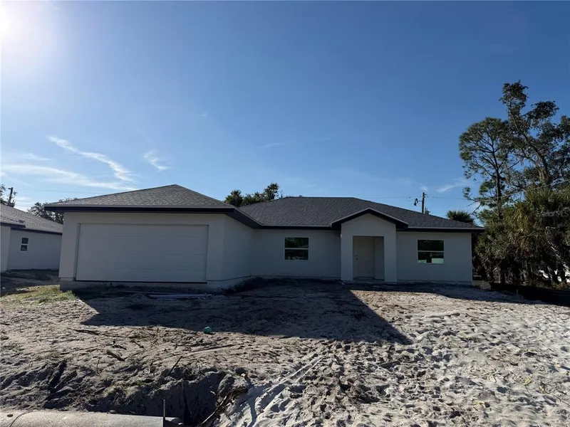 Under Construction. This newly constructed home is scheduled for completion at the end of March and is located on a quiet street surrounded by attractive, well-maintained homes. The property offers modern design, durable construction, and a convenient Southwest Florida location. Ideally situated near shopping, golf courses, and Gulf beaches, the home provides easy access to everyday amenities and major roadways. Built with engineered steel construction on a concrete slab and equipped with impact-rated windows, the residence is designed for strength, efficiency, and peace of mind. Interior features include upgraded tile flooring throughout and quartz countertops, creating a clean, contemporary look. The kitchen is equipped with stainless steel appliances and ample cabinetry, while the bathrooms offer well-appointed finishes. The primary suite features a separate shower and soaking tub, with a tub/shower combination in the secondary bath. Additional highlights include textured drywall finishes, quality trim details, a covered entry, full yard sod, and a functional floor plan well suited for both everyday living and entertaining. This is an excellent opportunity to own a brand-new home nearing completion in a desirable Port Charlotte location.