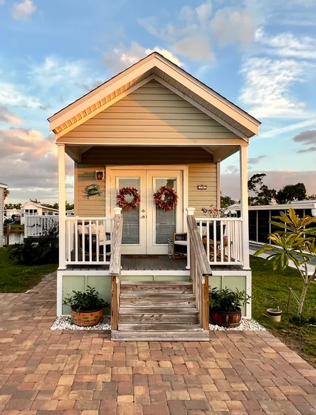 Beautiful, 2 bedroom, 1 bathroom, "Tiny Home" located minutes from Downtown Punta Gorda. Built in 2021, this home features an open floor plan, loaded with windows and a vaulted ceiling. The kitchen boasts full-sized, stainless steel appliances including a Whirlpool refrigerator with built-in ice maker and water filtration and a GE Stove, microwave and dishwasher. The primary bedroom features a built-in closet and dresser and is currently being used as an office. The 2nd bedroom/loft, which overlooks the living room, is fully carpeted, furnished with a queen-sized bed and still has a ton of space. The first-floor bath has a single sink with storage underneath, a built-in medicine cabinet, a stand-up shower and a linen closet. There is a side door that leads to a fully fenced, 16' x 10' wooden deck, overlooking the pond. The brick paver driveway has enough room for your car and a golf cart. This home is located in the Harbor Belle RV Resort, a 55+ community that features a community pool, fitness room, clubhouse, bocce court, shuffleboard, kayak & boat launch and there are community events year-round. This Non-Smoking home is being sold partially furnished and the seller is motivated. Land not included.