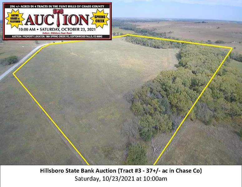 TRACT #3 (approx. 37 +/- ac): Smaller acreages in Chase County can be difficult to find, especially one within 1.5 miles of Cottonwood Falls! This property provides a nice mix of grass acres that have been hayed and timbered area with Spring Creek meandering in and out of the property throughout the south and east parts. The timber provides enough cover for lots of wildlife! The grass acres provide for good hay or offer the potential for a building site in the Flint Hills without miles and miles of gravel to get to town.