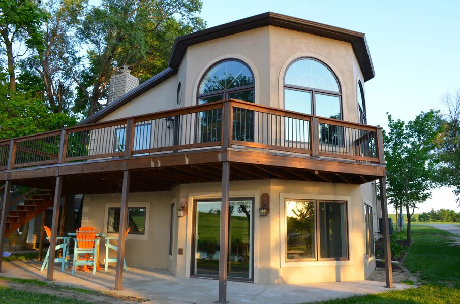 Deck and patio wrap the lakeside of the house creating additional entertaining space to enjoy the stunning views.