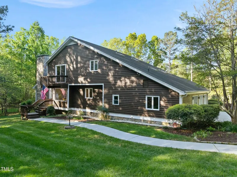 Very unique California contemporary home on over 7 acres with incredible privacy, a large pond, and horses are permitted. When you enter the gated entrance to the property, you are struck by the unique architectural, cedar siding, and beautiful landscaping. The driveway leads to the 3 car garage. As you walk towards the front entrance, you are captivated by the incredibly lush and diverse landscaping. When you enter the foyer, you immediately notice the soaring ceiling above the living room and the natural light provided by three skylights. You will discover a total of 14 skylights in the property. The beautiful stone fireplace mantle extends to the ceiling. You enter the large, updated kitchen with custom cabinetry, walk-in pantry, and a view of your gardens from the window above the kitchen sink. Through the kitchen is a full bathroom and a very large laundry room. Next to the kitchen is a large dining room overlooking the oversized family room. Next, walk through the sunroom and take in the view of the pond. Continue through to the large office or flex space that is connected to the garage. The stairs lead you to the second floor where three bedrooms await you. The large primary bedroom features a beautiful bathroom with a walk-in shower. There is a walk-in closet, dressing room, and then another closet or storage area. Take a moment to enjoy the view of the front yard from the balcony. Two more bedrooms await you, both with skylights and recently replaced sliding grass doors. They share a balcony and a full bathroom with a door separating the tub/shower from the sink area. Don't miss the 11 x 31 flex room with skylights that can be used as a bonus room, office, closet or storage. It is Not included in the square footage Outside, you will enjoy entertaining guests on the large decks with a great view. Take a walk through the backyard to appreciate the diversity and beauty of the landscaping. The yard is enclosed by a 1000 linear feet, 7.5 foot high fencing design to keep the deer out. The lot itself extends well beyond the fence. There is room for a workshop and/or barn and horses and chickens are permitted. 70% of the pond is located on the property. Crosswinds Estates is incredibly quiet, yet located just off of Rt. 64 two miles west of Jordan Lake and just through the woods from Seaforth High School. These properties rarely come on the market. Less than 15 minutes from downtown Pittsboro and 20 minutes to Cary. This is an incredible opportunity to own this very unique and desirable property that has been meticulously cared for by the owners.