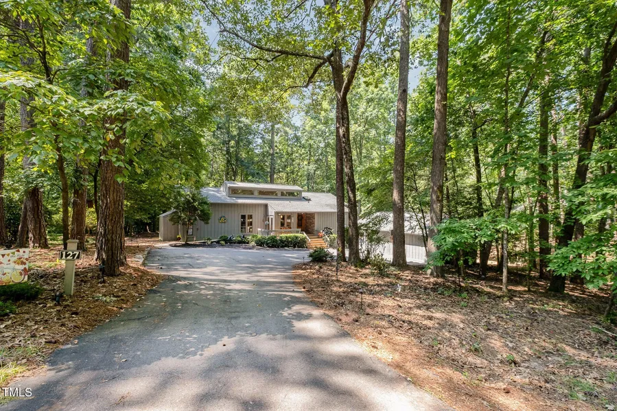 One-level contemporary home with a separate guest house/office/studio on a .9-acre lot in the ''historic district'' of Fearrington Village. This home blends into a wooded, natural setting and it has great privacy and views. Beautifully maintained and updated. The main house has an entry foyer, large living room with a wall of built-in shelving, fireplace, and vaulted ceiling with clerestory windows. The dining room can be at one end of the living room or in another space currently used as a sitting area adjacent to the kitchen. The kitchen features a well-organized pantry, an island, and a breakfast nook with a glass door that opens to the front deck. The primary bedroom suite is at one end of the house and includes a vaulted ceiling, private bath, walk-in closet, and a sunroom. The laundry room is conveniently located near the primary bedroom closet and provides a lot of storage space. ...